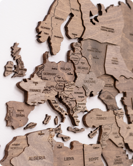 There is a die-hard cliché that wood is beyond competition and offers a timeless look. With our handcrafted wall maps, we could go on with more advantages. Our woodwork combines quality,and creative craftsmanship with time-tested wood types. Made of birch plywood, the wooden map is resistant to wear and tear. Besides, the elegant map design successfully transforms the mood of a room or entire place. This provides incredible value for your money.